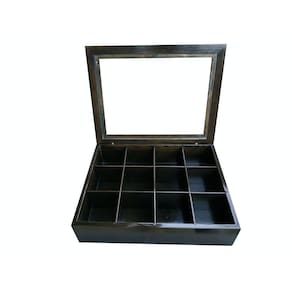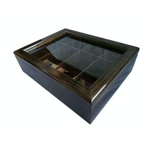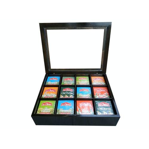 Prático e luxuoso, na linha madeira maciça encontrarmos um toque vintage, objeto decorativo onde são visíveis os veios naturais da madeira. Nossos estojos/caixas irão facilitar seu dia a dia com a organização para os saches de Chá, além de proporcionar um ambiente mais sofisticado e elegante.Produzida com madeira natural de reflorestamento. Escolhida rigorosamente, totalmente tratada, tingida e envernizada externamente. Internamente. Na linha madeira maciça é possível observar os veios naturais da madeira. A tampa possui visor com vidro transparente. O acabamento interno com as divisórias é feito na própria madeira.Características das caixas para chá:Padrão Ébano;Produto fabricado em madeira maciça de qualidade;Não empena;Tampa de vidro 2 mm;Medidas aproximadas dos casulos (larg x comp x alt): 7,5 x 7,5 x 7,0 cm.Chás não acompanham o estojo Imagens meramente ilustrativas