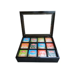 Prático e luxuoso, na linha madeira maciça encontrarmos um toque vintage, objeto decorativo onde são visíveis os veios naturais da madeira. Nossos estojos/caixas irão facilitar seu dia a dia com a organização para os saches de Chá, além de proporcionar um ambiente mais sofisticado e elegante.Produzida com madeira natural de reflorestamento. Escolhida rigorosamente, totalmente tratada, tingida e envernizada externamente. Internamente. Na linha madeira maciça é possível observar os veios naturais da madeira. A tampa possui visor com vidro transparente. O acabamento interno com as divisórias é feito na própria madeira.Características das caixas para chá:Padrão Ébano;Produto fabricado em madeira maciça de qualidade;Não empena;Tampa de vidro 2 mm;Medidas aproximadas dos casulos larg x comp x alt : 7,5 x 7,5 x 7,0 cm.Chás não acompanham o estojo Imagens meramente ilustrativas
