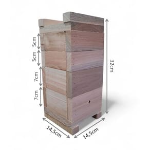 O design funcional com duas melgueiras facilita a coleta do mel e a expansão da colônia, tornando o manejo mais prático e produtivo. Além disso, a resistência do eucalipto garante longa vida útil ao produto, mesmo em ambientes externos.