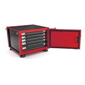 Estrutura em chapas de aço conformadas de 1,2 mm.5 gavetas com corrediças telescópicas. Fechadura reforçada com chave. Porta com borracha de vedação contra poeira. Pintura eletrostática.Capacidade de carga máxima gavetas com altura de 50 mm: 30 kg. Capacidade de carga máxima gavetas com altura de 105 mm: 40 kg. 4 pés com sistema de amortecimento antivibração (Vibra stop).Utilizado para o armazenamento de ferramentas e base de trabalho para manutenção de peças. Capacidade de carga e resistência da estrutura comprovadas através de testes práticos.