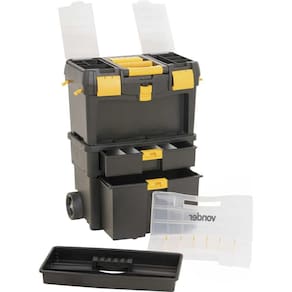 Possui tampa com estrutura reforçada com 2 compartimentos, bandeja para ferramentas removível, bandeja frontal destacável com múltiplas divisórias, alça dobrável, rodas para transporte e travas reforçadas além de ganchos na lateral superior para enrolar extensão elétrica de cabo fino.