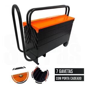CARACTERÍSTICAS: - A Caixa 7 Gavetas Presto além de ajudar a organizar e transportar ferramentas, busca atender às mais diversas necessidades de organização. Possui 7 gavetas, sendo 1 grande e 6 pequenas, com duas rodas siliconadas e uma alça retrátil para movimentação. - Caixa reforçada. - Dobra em todas as gavetas. - Rodízios de qualidade. - Local para cadeado. - Tratamento antiferruginoso. - Pintura eletrostática a pó.