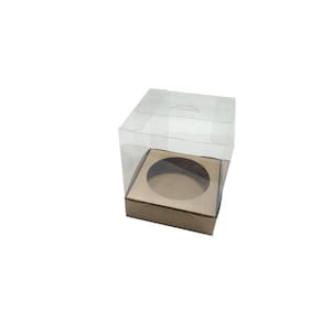 Especificações: Caixa: Transparente Medidas: 10 x 10 x 12 cm Comprimento X Largura X Altura Material da Caixa: Acetato 200 micras 0,20 Material do Berço e da Base: Papel Kraft 250g Para Panetones de Até 100g Pode suportar tamanhos maiores, verifique medidas Circunferência útil do Berço: 25cm Diâmetro útil do berço: 8cm Altura útil: 12cm