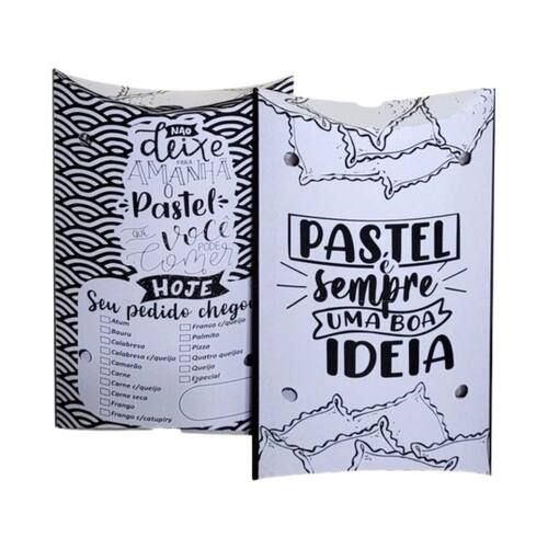 Embalagem para pastel, ideal para food truck, quiosques, lanchonetes, etc. Produzido em papel (fundo branco) ideal para alimentos; com saída de vapor para que o pastel chegue quentinho e crocante até a casa de seu cliente, e com espaço para escrever o sabor do pastel, muito prático, tudo o que seu delivery precisa em uma única embalagem.