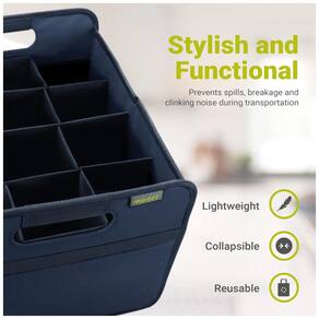 SUPORTA ATÉ 29 kg. Caixa resistente dobrável para transportar vinho ou outras garrafas cabe em champanhe. Alças reforçadas acolchoadas e dois bolsos de malha para guardar acessórios de vinho. Dobra se em três etapas fáceis. A inserção é removível e dobra plana