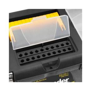 Conteúdo da Embalagem: 1 Caixa plástica Indicada para organizar, armazenar e transportar ferramentas, peças e acessórios em geral Possui duas travas, três compartimentos externos dois removíveis e bandeja para ferramentas removível Comprimento da caixa plástica:415,0 mm Largura da caixa plástica:210,0 mm Altura da caixa plástica:190,0 mm Material da caixa plástica:Polipropileno Cor da caixa plástica:Preta e amarela Capacidade de carga kgf :8 kgf Marca: Não Informado
