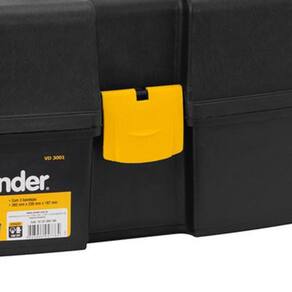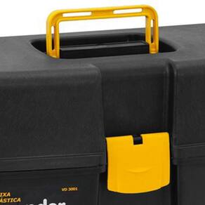 Caixa plástica Para Ferramentas Vonder. - Fabricado em polipropileno - Indicada para organizar, armazenar e transportar ferramentas, peças e acessórios em geral - Possui três bandejas fixas e articuladas com divisórias removíveis - Comprimento da caixa plástica mm :370,0 - Largura da caixa plástica mm :220,0 - Altura da caixa plástica mm :200,0 - Cor da caixa plástica:Preta e amarela - Capacidade de carga: 6 kg Marca: Não Informado