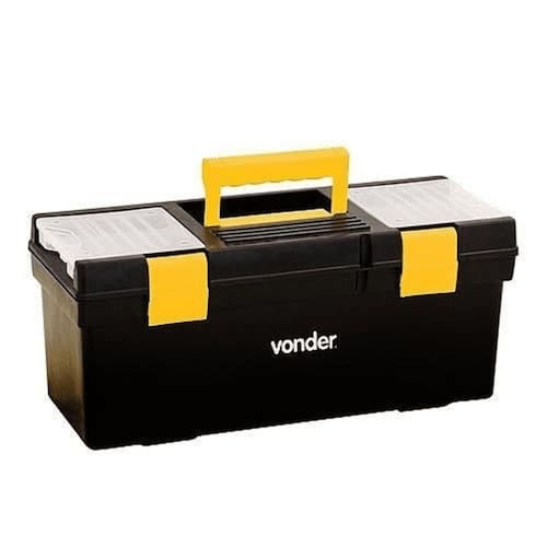 Indicada para guardar, organizar e transportar ferramentas diversas Possui duas travas, dois compartimentos externos e bandeja para ferramentas removível Capacidade máxima: 8Kg Fabricado em polipropileno Dimensões: Comprimento: 400mm Largura: 155mm Altura: 160mm Marca: VONDER Ref.VONDER-6105400000 Cor: Preto