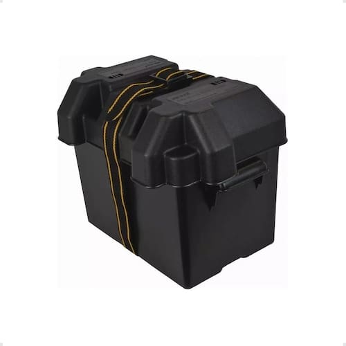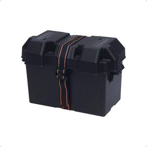 Caixa protetora para bateria produzida em plástico a prova de corrosão e resistente as adversidades do ambiente marinho. Possui tampa com ventilação e cinta de segurança que envolve caixa e tampa, prendendo ambas e protegendo a bateria.