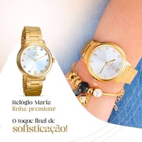 Caixa + Pulseira Pandora + Relógio Feminino Dourado Aço Inox Strass Moda Casual Social Presente Surpreenda a Maria da sua vida com o Conjunto Elegante Orizom Maria: Relógio Feminino Analógico Banhado a Ouro + Pulseira Pandora Banhada Dourada com Pedras de Strass Negras. Este conjunto exclusivo é a combinação perfeita de estilo e sofisticação. O relógio analógico feminino da marca Orizom Maria é banhado a ouro e possui detalhes elegantes em aço inoxidável, garantindo durabilidade e precisão. Além disso, é resistente à água, ideal para no dia a dia.