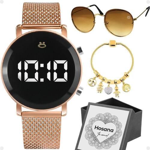 Caixa + Pulseira + Relogio Feminino Digital Aço + Oculos Sol Kit Especial Orizom Maria para Presentear Quem Você Ama! Relógio Digital Feminino Orizom Maria: Com design elegante e moderno, maquinário dourado banhado a ouro e pulseira em silicone preto ajustável.