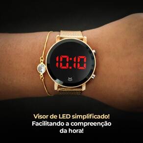 Caixa + Relógio Digital Feminino Aço Inox + Colar Brinco Presente Casual Led Social Kit Elegância Moderna: Relógio Digital Feminino Dourado Orizom Maria + Colar e Pulseira com Strass Transparente + Caixa Premium Apresentamos o Kit Elegância Moderna, um conjunto exclusivo que une funcionalidade e sofisticação em um só lugar.