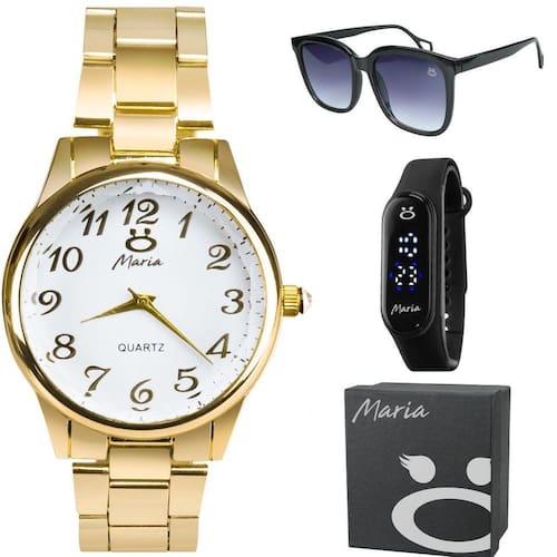 - Relógio Analógico Feminino Orizom Maria Dourado: Aço Inoxidável Banhado, com Pedrinha de Strass no Pino, para um toque de sofisticação e brilho sutil. - Relógio Digital Feminino Orizom Maria: Forma de Bracelete com Pulseira Ajustável de Silicone, combinando estilo e funcionalidade de forma única. - Óculos de Sol Preto Orizom Maria: Proteção UV de Qualidade Premium, garantindo proteção e estilo durante os dias ensolarados. - Caixa Premium Orizom Maria para uma apresentação impecável.