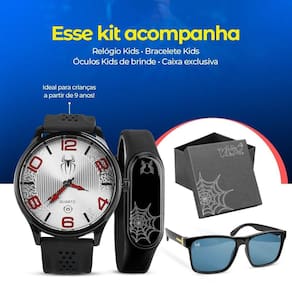 - 1 Relógio Orizom Spaceman Temático Homem-Aranha com Pulseira em Silicone Ajustável - 1 Relógio Digital Orizom Kids Temático Homem-Aranha em Formato de Bracelete Ajustável de Silicone - 1 Óculos de Sol Orizom Kids Temáticos Homem-Aranha com Proteção UV - 1 Caixa Premium Orizom Kids Temática Homem-Aranha
