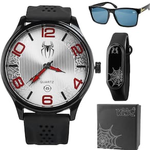 - 1 Relógio Orizom Spaceman Temático Homem-Aranha com Pulseira em Silicone Ajustável - 1 Relógio Digital Orizom Kids Temático Homem-Aranha em Formato de Bracelete Ajustável de Silicone - 1 Óculos de Sol Orizom Kids Temáticos Homem-Aranha com Proteção UV - 1 Caixa Premium Orizom Kids Temática Homem-Aranha