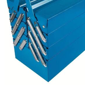A Caixa Sanfonada Tramontina é equipada com 7 gavetas que oferecem excelente capacidade de organização. Cada gaveta pode ser usada para guardar diferentes tipos de ferramentas, acessórios, parafusos e peças pequenas, com a vantagem de manter tudo arrumado e de fácil acesso. As gavetas deslizam suavemente, permitindo abrir e fechar com praticidade, facilitando o manuseio e o transporte de ferramentas.