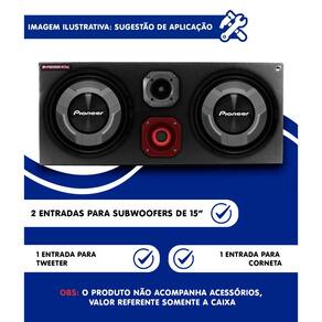 CARACTERÍSTICAS - Capacidade completa: suporte para 2 subwoofers de 12", 1 corneta e 1 tweeter, ideal para sistemas de som automotivo potentes; - Estrutura selada com volume interno de 60 litros, garantindo graves mais controlados e redução de distorções; - Acabamento resistente: confeccionada em MDF de 15–18 mm, revestida com courvin perfurado preto e manta isolante acrílica interna; - Fixação segura: equipada com plugs parafusados com fio e vedação com cola branca e serragem, evitando vibrações indesejadas.