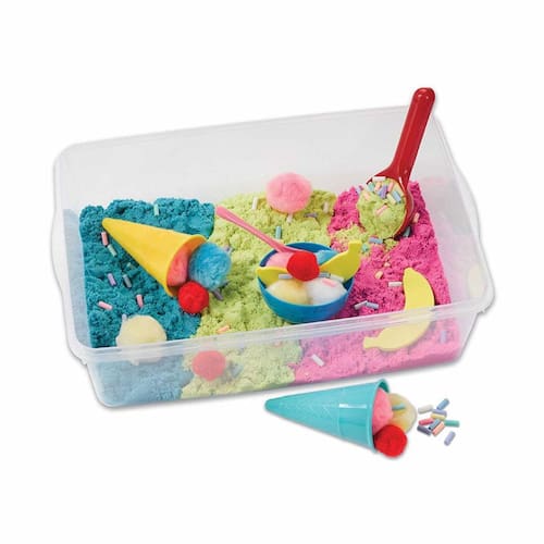 As crianças pequenas embarcarão em uma aventura de criação e aproveitarão horas de brincadeiras imaginativas enquanto pegam, separam e exploram os tesouros dentro do Kit Sensory Bin Ice Cream Shop!