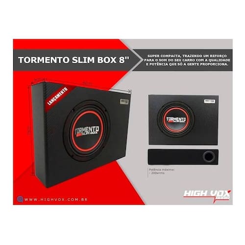 Caixa Slim Sub Woofer Tormento Alto Falante 200Wrms 8 Pol A Caixa Slim Box Subwoofer Tormento conta com um potente alto-falante 200w RMS de 8 polegadas de excelente resposta de frequência proporcionando graves mais encorpados, somando qualidade ao som do seu carro. Descrição e Especificações Técnicas Linha Slim Box Caixa Acústica Subwoofer Tormento 8 Potência Máxima: 200 Watts RMS Impedância: 4 Ohms Revestimento: Adesivo em Fibra de Carbono 6 meses contra defeito de fabricação Ean: 0320202004003