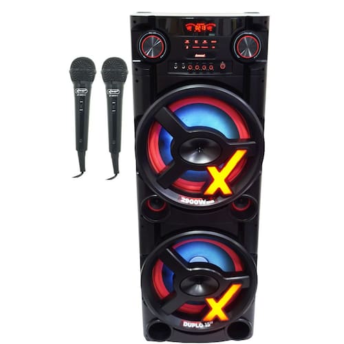 Itens inclusos: 1 Caixa de Som, 1 Cabo Rca, 1 Cabo de alimentação, 2 Microfone com Fio, 1 Manual (português)
