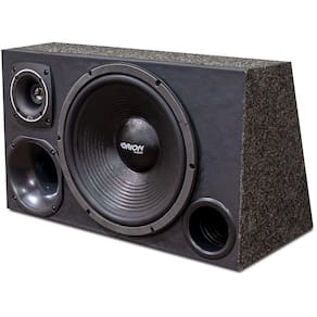 CAIXA TRIO 12 DUTADA Revestimento em Carpete Cinza e Frente Corvin Preto Dimensões: Altura 33cm x Largura 55cm Profundidade Superior: 23cm x Inferior: 16cm Inclinação: 34cm Duto 3 polegadas Produto de Fabricação Artezanal ( Poderá sobre pequenas alterações )