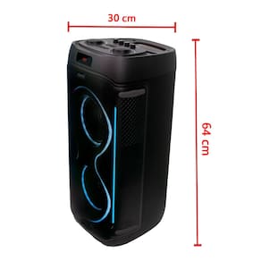 Medidas da caixa de som: 64 x 30 x 30 cm (altura x largura x profundidade)