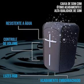 - som potente de excelente qualidade, limpo e com ótimos graves, você vai curtir muito - resistente, à água e à prova de poeira ipx6 - design ousado com diversas cores para combinar com qualquer estilo. - bateria com maior duração do mercado, média de 10 horas - bluetooth 5.0, conexão estável e segura - luzes em led rgb, que alteram de acordo com a batida da música -tecnologia tws, é possível parear mais de uma caixa para tocar juntas. - possui rádio fm, micro sd e entrada usb para pendrive. - recarregável com entrada usb tipo-c