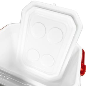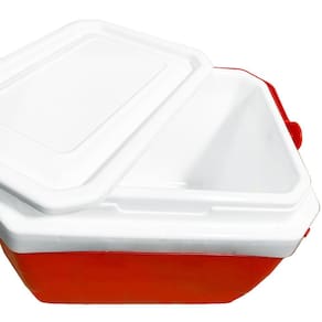 Caixa térmica de plástico com alça e porta copos na tampa. Comporta aproximadamente 12 garrafinhas de água de 500ml (a quantidade pode variar de acordo com o tipo de alimento/bebida/objeto que será armazenado).