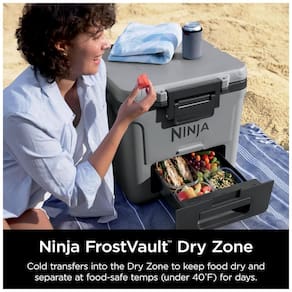 A caixa térmica com rodas Ninja FrostVault 30QT foi desenvolvida para conservação de bebidas e alimentos em ambientes externos, com isolamento de alto desempenho e gaveta inferior em zona seca refrigerada. A tecnologia FrostVault transfere o frio do compartimento principal para a gaveta Dry Zone, mantendo os alimentos frios, secos e separados do gelo, em faixa de temperatura segura abaixo de 4,5°C por vários dias quando utilizada com gelo adequado.