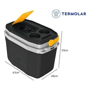 Ficha Técnica: - Marca: Termolar - Cor: Preto e Amarelo - Capacidade: 20L - Conservação Térmica: 12h sem gelo / 24h com gelo - Material Externo: Plástico - Isolamento Térmico: Poliestireno Expandido EPS - Livre de BPA: Sim - Material Atóxico: Sim