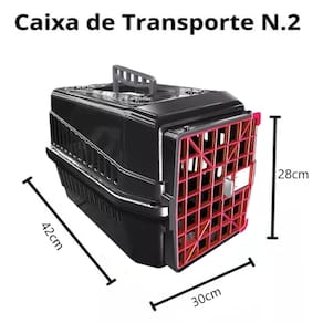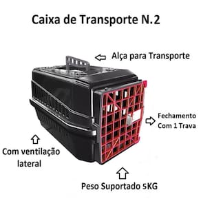 Especificações: - Produzida totalmente em plástico polipropileno injetado com alta durabilidade - Fixação da tampa superior com a base por parafuso inox, sendo sua montagem muito fácil - Higiênica: pode ser lavada - Com ventilação lateral - Apto para viagens de avião - Peso suportado de até 5Kg - Cor: Preto com porta vermelho - Caixa de transporte tamanho N2