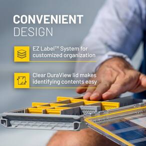 - Características de design conveniente para facilitar o uso incluem uma tampa transparente DuraView para identificar rapidamente o conteúdo e uma trava grande que permite abrir e fechar com uma só mão.