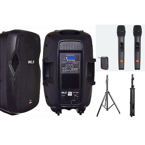 Kit composto de 1 Caixa Acústica WLS 15 Ativa com Bluetooth + 1 Caixa 15 Passiva + 2 microfones sem fio JBL MICBR2 + 2 tripés