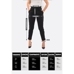 tamanho P: cintura 80 cm; comprimento 98 cm; gancho 31 cm; quadril 100 cm; bainha 30 cm.