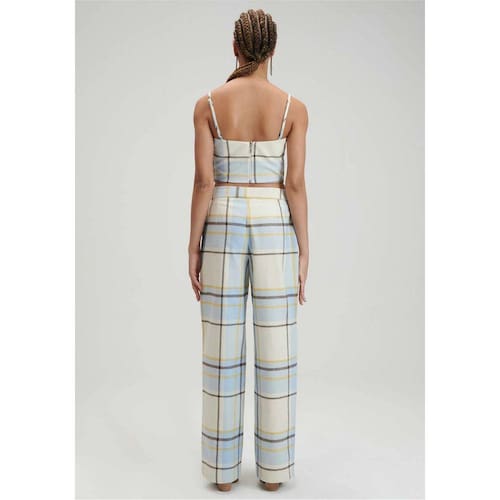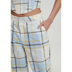 A calça com estampa xadrez é uma opção moderna e elegante. A alfaiataria permite compor um look sofisticado, além de possuir cintura alta e caimento confortável. Combine com tops da mesma padronagem.