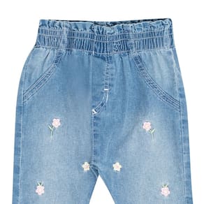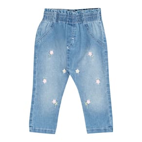 Sua pequena fashionista no estilo e conforto que ela merece com nossa calça jeans na cor indigo claro com elastano na cintura para maior conforto e segurança para usar no dia a dia. Para deixar a peça ainda mais fofa e moderna que tal bordados de flores na parte frontal da calça? Uma fofura né!