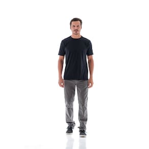 É uma calça com modelagem conservadora, mesmo padrão da clássica, ou seja, não fica super justa, possui pernas retas, porem levemente ajustadas ao corpo devido a rigidez do elastano em sua composição. É a peça indispensável no guarda roupa masculino, transitando em várias ocasiões de uso, desde o casual ao Sport-chique.