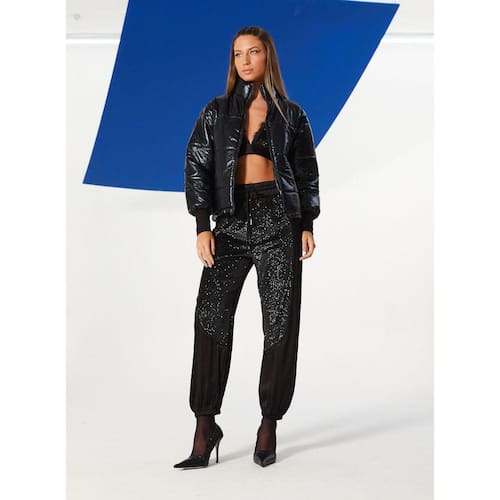 Descrição Calça apresenta shape reto e modelagem comfy. Peça possui cintura alta, cós duplo em elástico com cadarço de amarração embutido, recortes frontais, corpo em corte amplo e barra inferior com elástico interno. Composição Corpo, 91% Poliéster, 9% Elastano, Detalhe, 100% Viscose