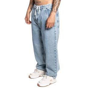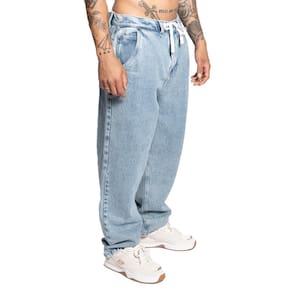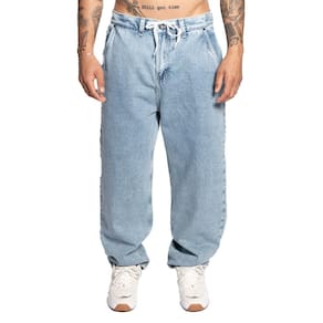 Calça Dc Shoes five pockets feita em modelagem oversize, costuras com linha palha, lavanderia sal e pimento clara e cordão interno de ajuste.