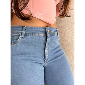 A calça da imagem é um modelo jeans feminino skinny de cintura alta. A peça tem uma lavagem clara clássica, sem detalhes como rasgos ou desfiados. Possui passadores para cinto e bolsos frontais e traseiros, com um corte ajustado que se molda ao corpo da cintura até a barra. Marca: Não Informado