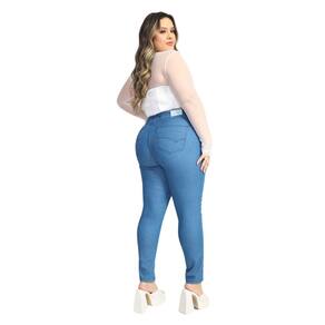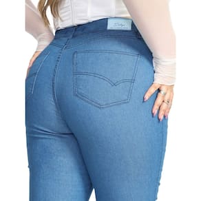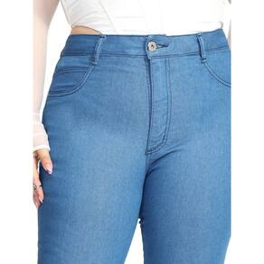 Calça skinny midi plus size de lavagem clara. Não possui forro de bolso.