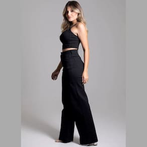 Calça feminina confeccionada em sarja. O modelo possui cintura super alta, gancho no lugar e caimento amplo da coxa até a barra. Cintura alta Fechamento através de um botão e zíper Bolsos frontais e posteriores funcionais. Barra simples Tecido: Sarja Tipo de Lavagem: Color Cor: Preto Composição:73% Algodão 24%Poliéster 3%Elastano Medidas Modelo Manequim 38