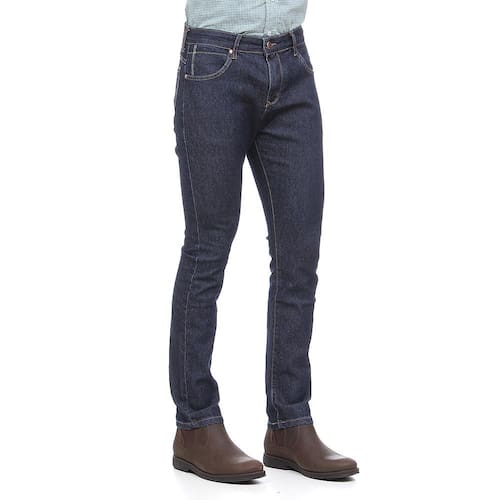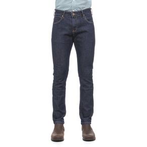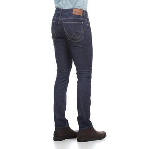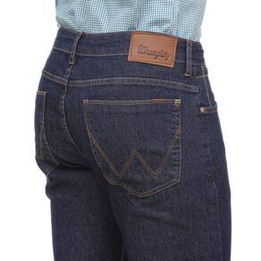 Calça Wrangler masculina modelo Slim fabricada em tecido 69% Algodão, 29% Poliéster e 2% Elastano na cor Azul. Possui três bolsos frontais e dois traseiros em modelo tradicional com etiqueta da marca.