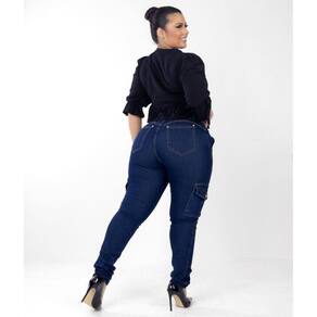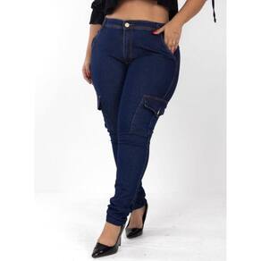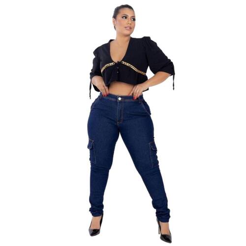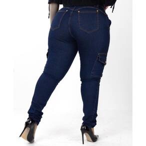 Calça cargo plus size jeans escuro cintura alta e bolso faca