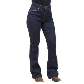 Calça Jeans feminina da marca Wrangler modelo Flare, fabricada em tecido jeans de alta qualidade na cor Azul Escuro. Possui 5 passadores, 3 bolsos frontais e 2 bolsos posteriores, perna ajustada que vai se alongando perfeita para se usar com botas e etiqueta da marca costurada no bolso posterior.