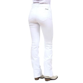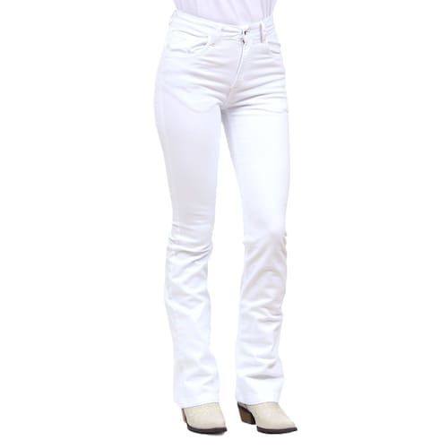 Calça Jeans Feminina na qualidade Cowboy Winner modelo Boot Cut, fabricada em tecido Brim trabalhado na cor Branco, possui 3 bolsos na frente e 2 atrás em modelo tradicional, rebites de metal e botão personalizado.