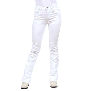 Calça Jeans Feminina na qualidade Cowboy Winner modelo Boot Cut, fabricada em tecido Brim trabalhado na cor Branco, possui 3 bolsos na frente e 2 atrás em modelo tradicional, rebites de metal e botão personalizado.