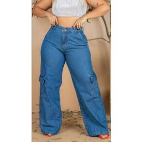 Calça Jeans Feminina Cargo Plus Size Cintura Alta - Azul médio - 46