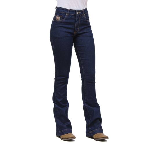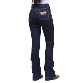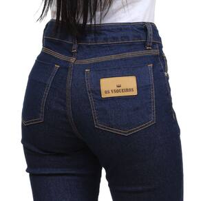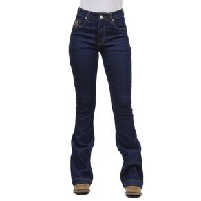 Calça jeans feminina na qualidade Os Vaqueiros modelo Flare, fabricada em tecido denim trabalhado na cor Azul Escuro, possui 3 bolsos na frente e 2 atrás em modelo tradicional, rebites de metal e botão personalizado.