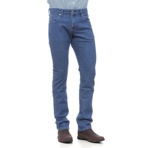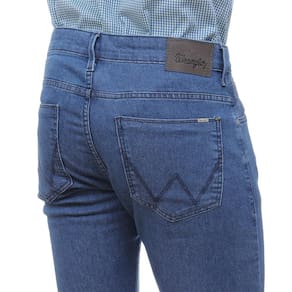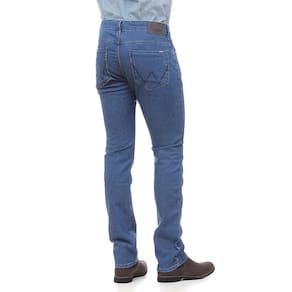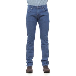 Calça Wrangler masculina modelo Slim fabricada em tecido 69% Algodão, 29% Poliéster e 2% Elastano na cor Azul. Possui três bolsos frontais e dois traseiros em modelo tradicional com etiqueta da marca.